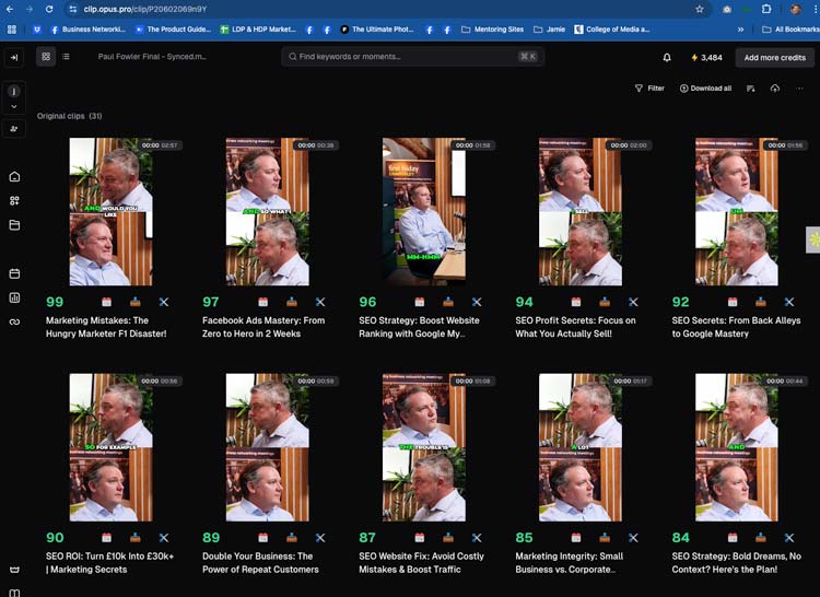 Each episode typically produces 15 to 20 short clips, all edited in CapCut and OpusClip.